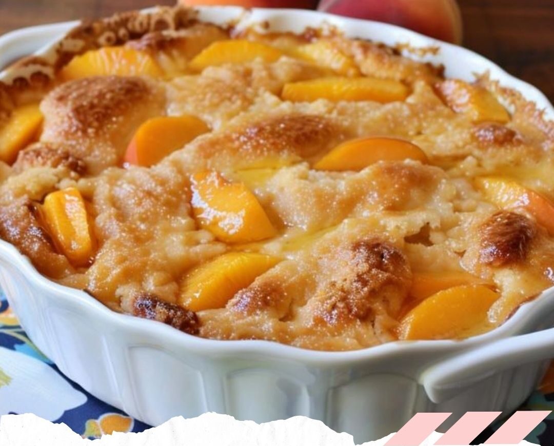 - In a mixing bowl, toss the sliced peaches with 1/2 cup of sugar. Spread the sugared peaches evenly in the bottom of the prepared baking dish.