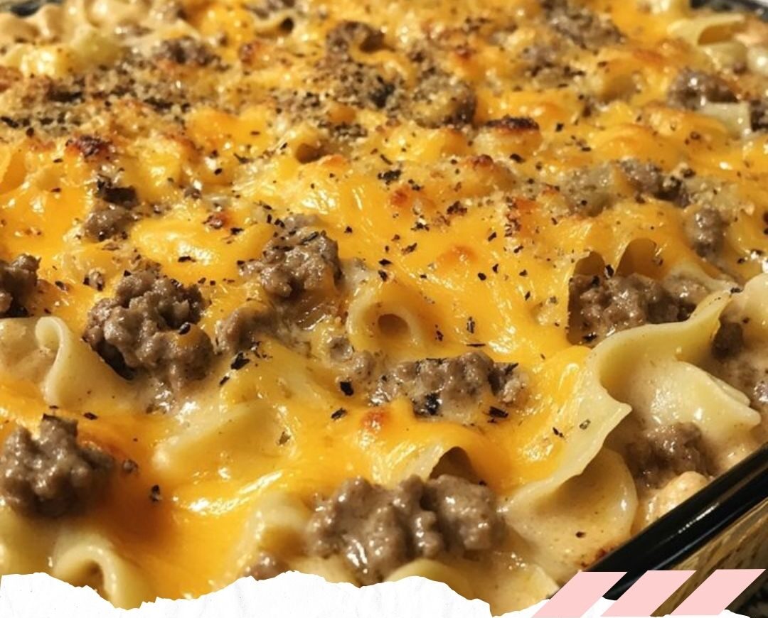 5. In a baking dish, layer cooked noodles, beef mixture, soup mixture, and shredded cheese.