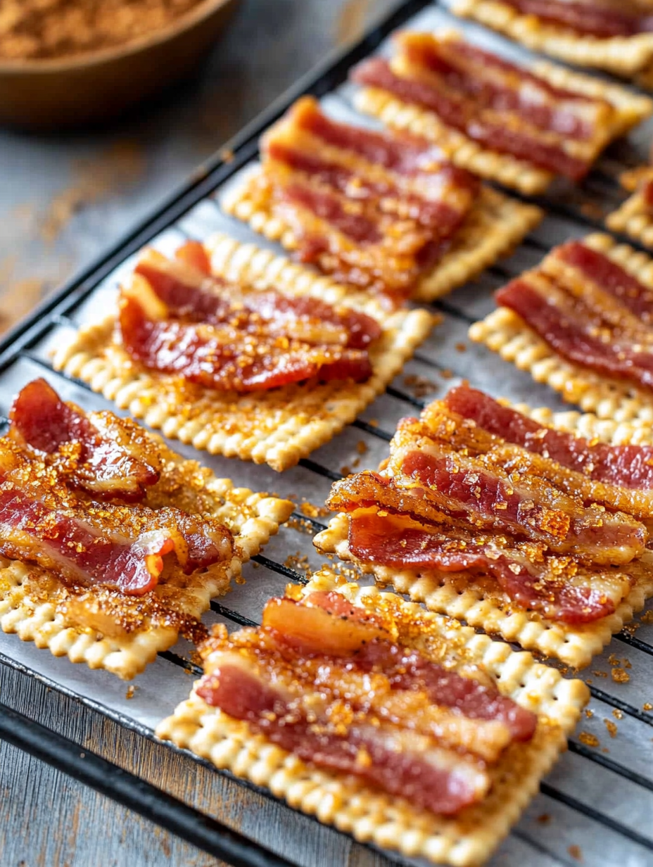 Bacon Crackers are bite-sized snacks made with crackers topped with bacon and brown sugar, then baked until crispy and caramelized.