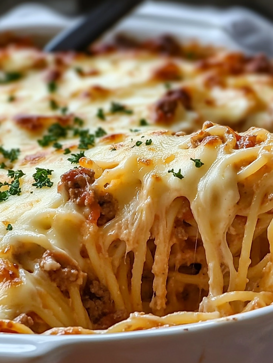 Unlike traditional spaghetti served straight from the pot, this version is oven-baked, which brings all the flavors together into one rich, cohesive dish. Imagine spaghetti dressed up for a cozy dinner party — same ingredients, just elevated.