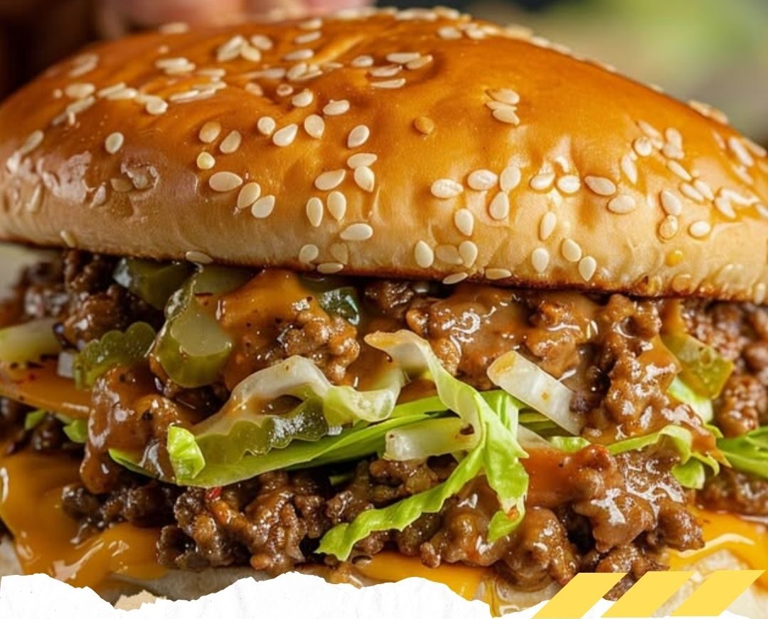 4- Toast the hamburger buns and start assembling the Sloppy Joes: spread a generous amount of special sauce on the bottom buns, then top with the beef mixture, shredded lettuce, pickles, and cheddar cheese.