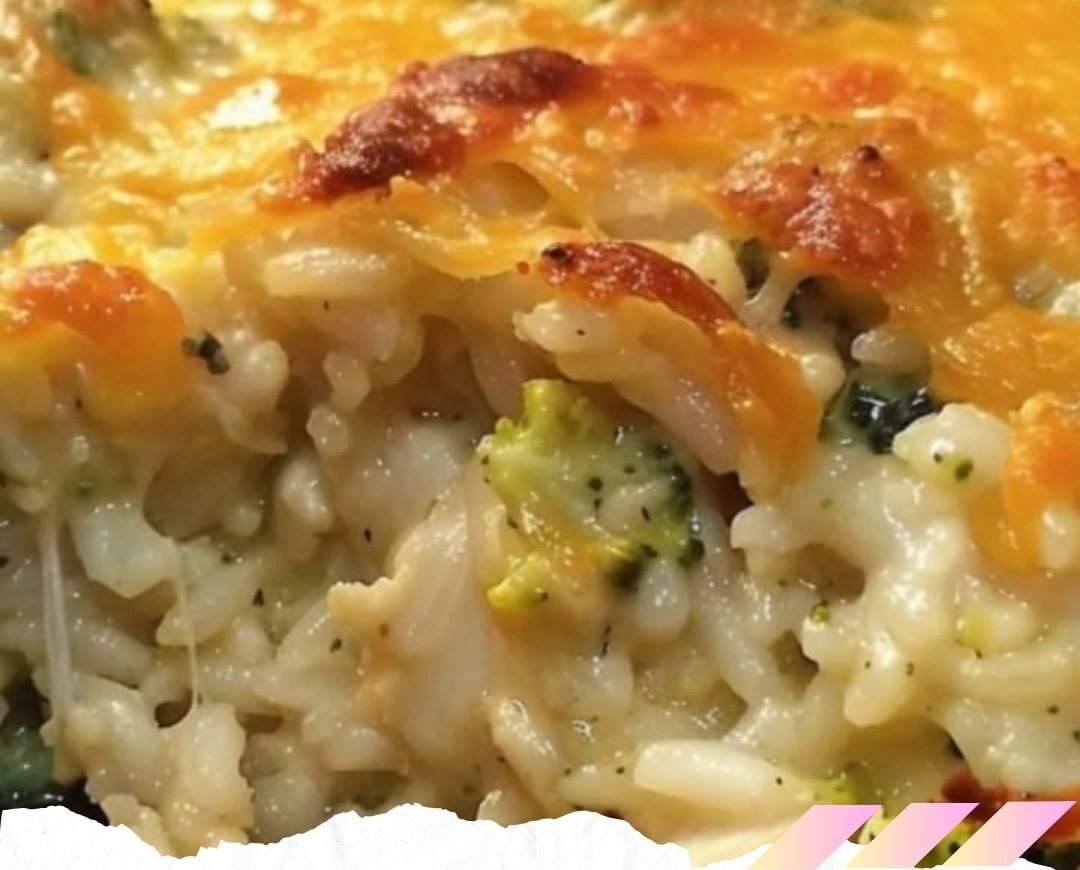 In a 9×13 inch baking dish, combine the prepared rice, chunk chicken, cream of mushroom soup, cream of chicken soup, butter, milk, broccoli, onion, and processed cheese.
