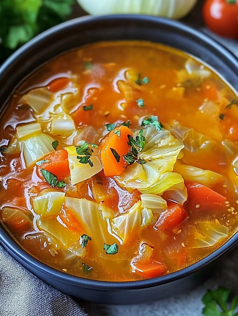 Cabbage Fat-burning Soup is a light vegetable soup primarily made with cabbage and other nutrient-rich vegetables. It gained attention through the “cabbage soup diet,” a short-term weight-loss approach that focuses on low-calorie meals.