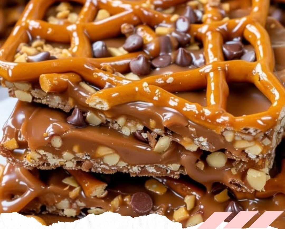 6- Pour the caramel mixture over the pretzels in the baking dish, spreading it out evenly.