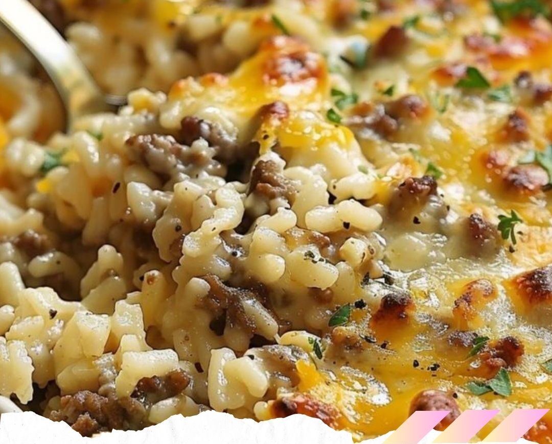9. Serve hot, garnished with additional herbs if desired. Enjoy your creamy and cheesy beef and mushroom rice bake!