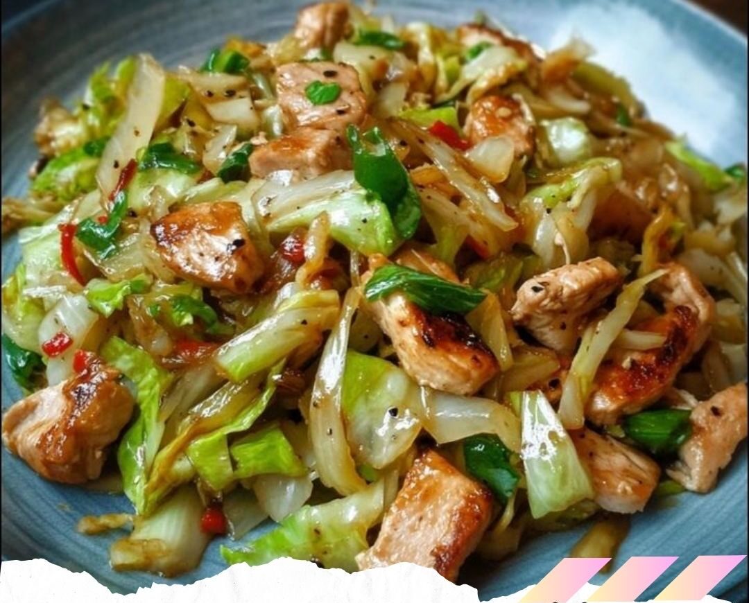 5. Pour in the prepared sauce mixture and stir-fry for 1 minute until the sauce thickens and coats the chicken and cabbage evenly.
