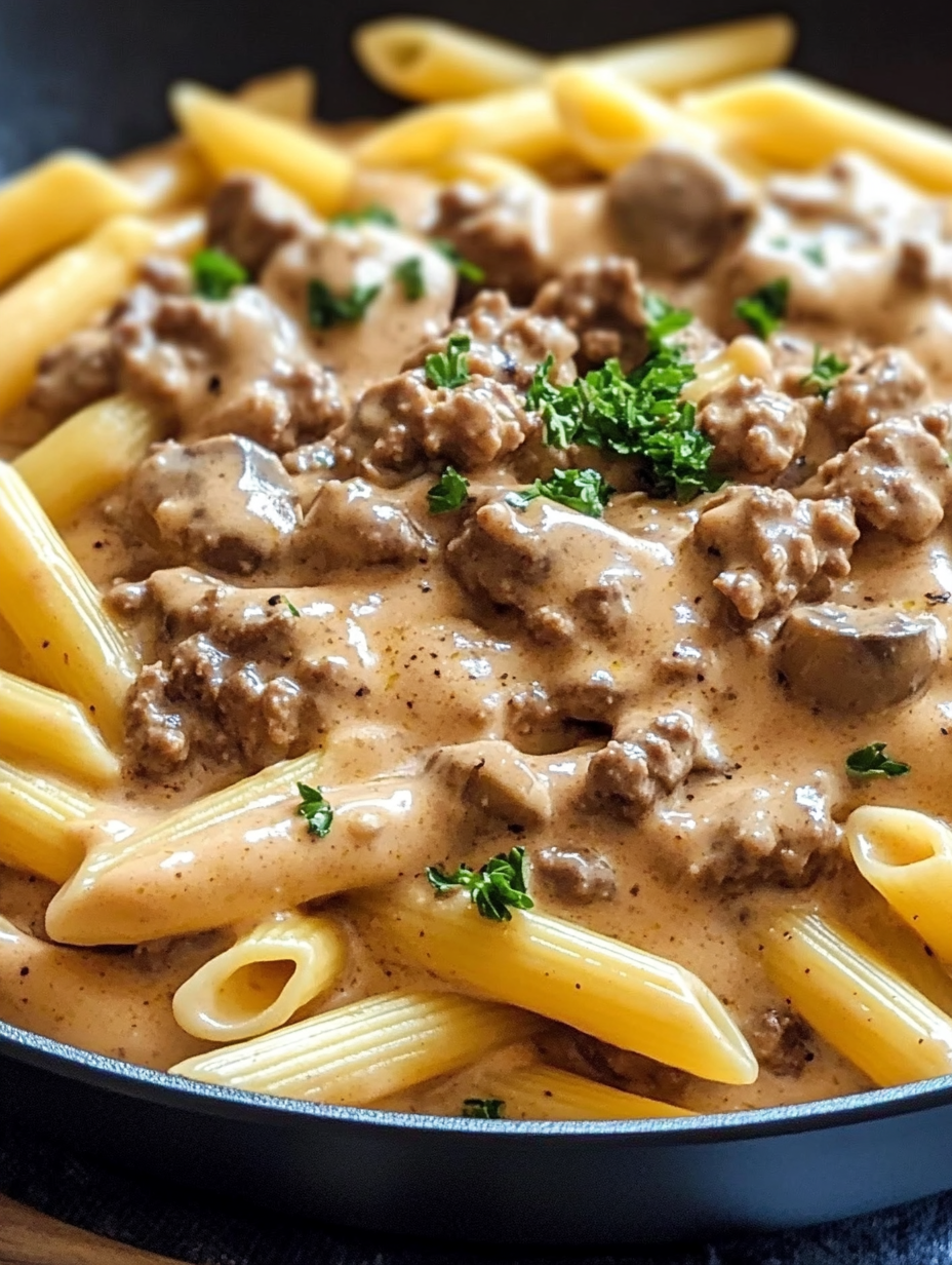 While traditional stroganoff often uses egg noodles, penne pasta works beautifully in this recipe.