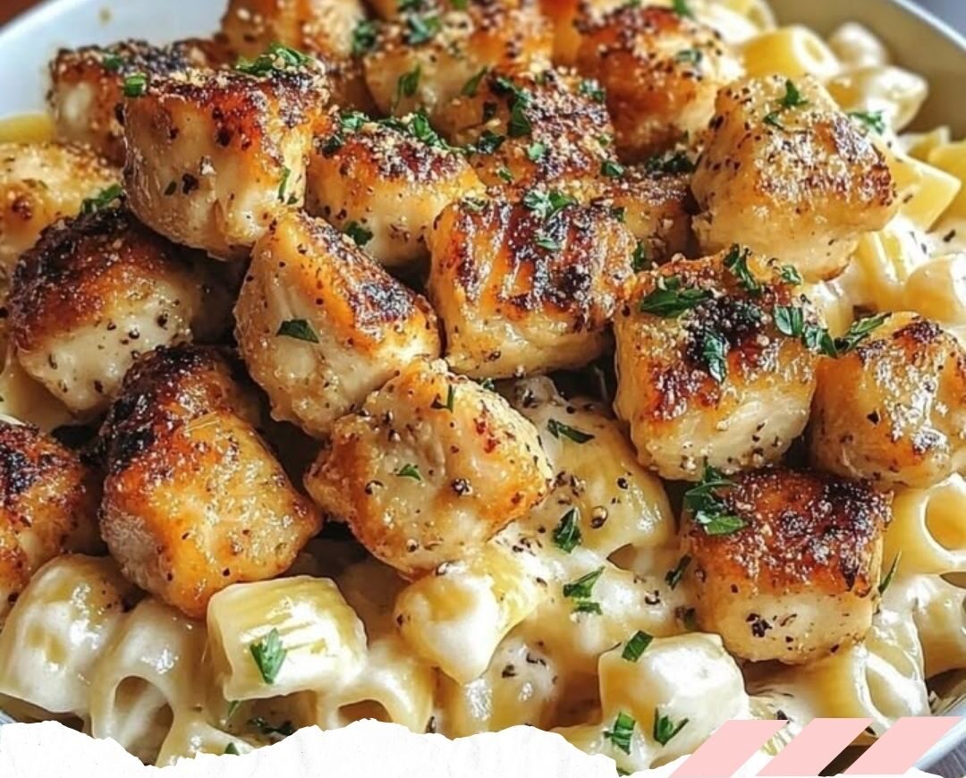 In a skillet, melt the butter over medium heat. Add the minced garlic and cubed chicken, cooking until the chicken is golden brown and fully cooked.