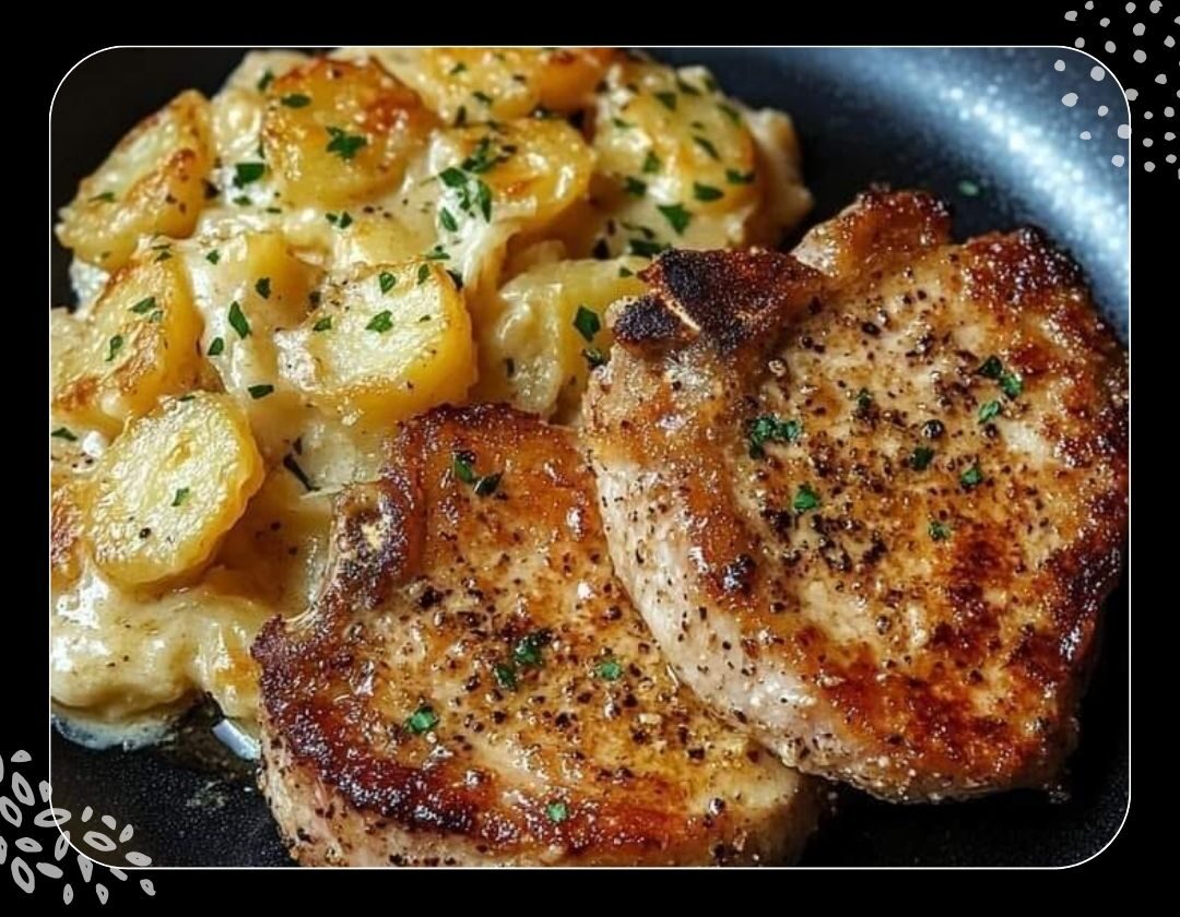 This meal strikes the perfect balance between rich flavors and comforting textures. The pork chops are tender and juicy, while the scalloped potatoes are creamy with a crispy golden top. It’s the kind of meal you imagine eating at grandma’s house on a Sunday evening — timeless, hearty, and made with love.