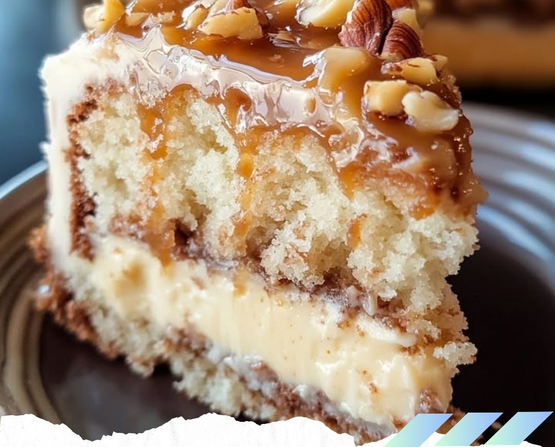 Add the second chocolate cake layer and pour the remaining caramel nut topping over the top, allowing it to drip down the sides.