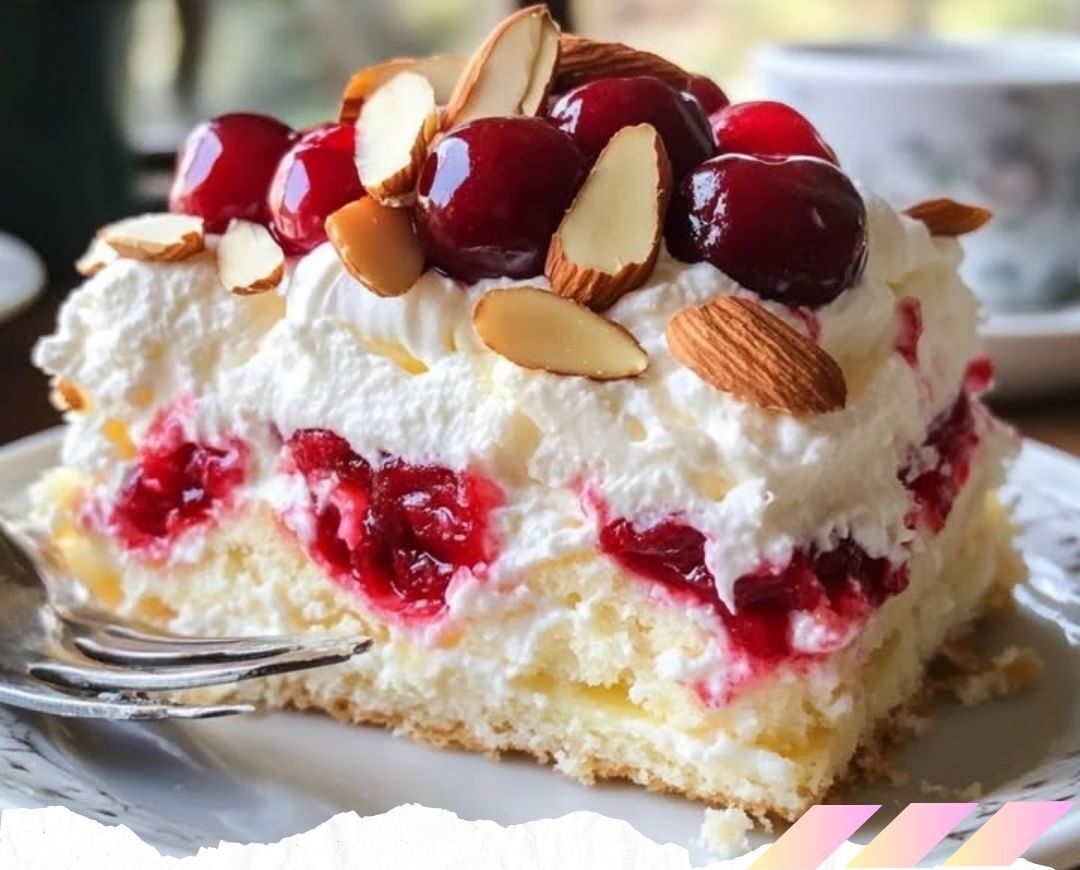 2. Pour 2/3 of the cherry pie filling evenly over the cake.