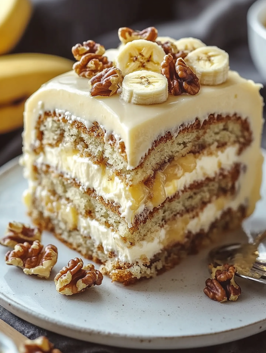 Think of it as comfort in a slice — every bite offers creamy custard, banana-infused softness, and nutty crunch. Whether served cold or slightly warm, this cake captures hearts (and appetites) effortlessly.