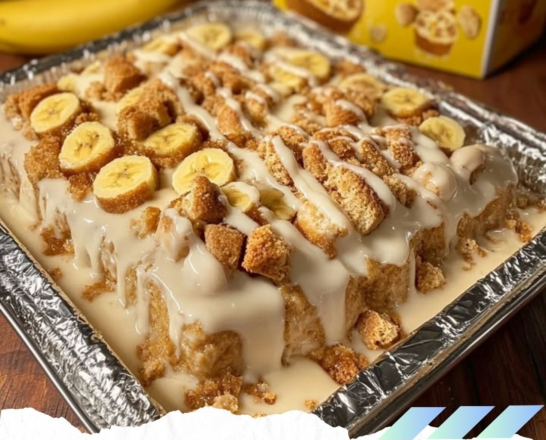 In a 9×13-inch tray, layer the bottom with half of the sliced or crumbled Honey Buns. Spread half of the banana pudding over the Honey Buns, followed by half of the cream layer. Add a layer of banana slices, then repeat with the remaining Honey Buns, pudding, and cream layer.