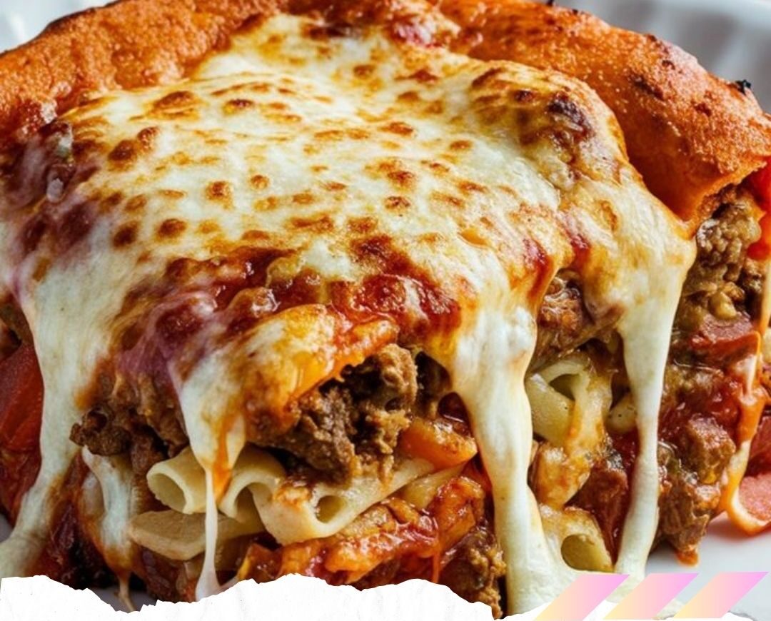 - In the prepared baking dish, layer half of the cooked pasta, meat sauce, mozzarella cheese, pepperoni slices, and bacon. Repeat layers.