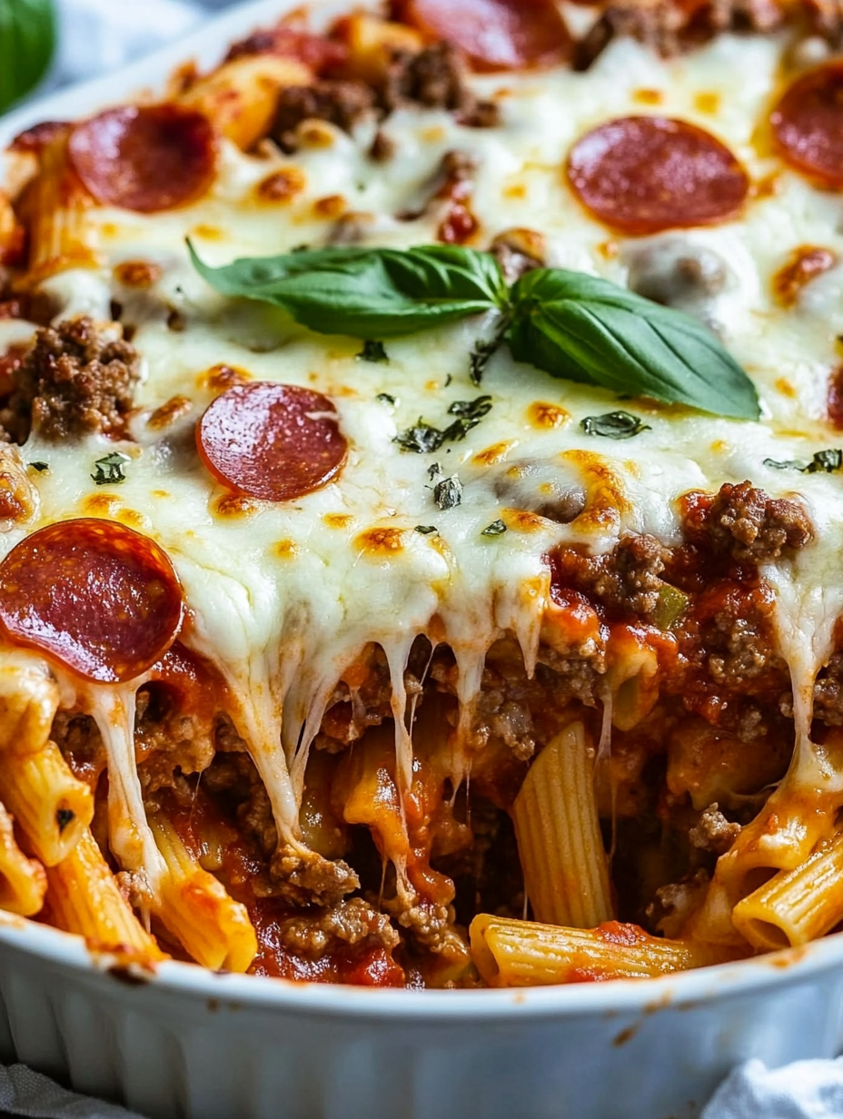It’s pizza, pasta, and comfort food rolled into one dish. No slices, no crust battles—just scoop and enjoy.