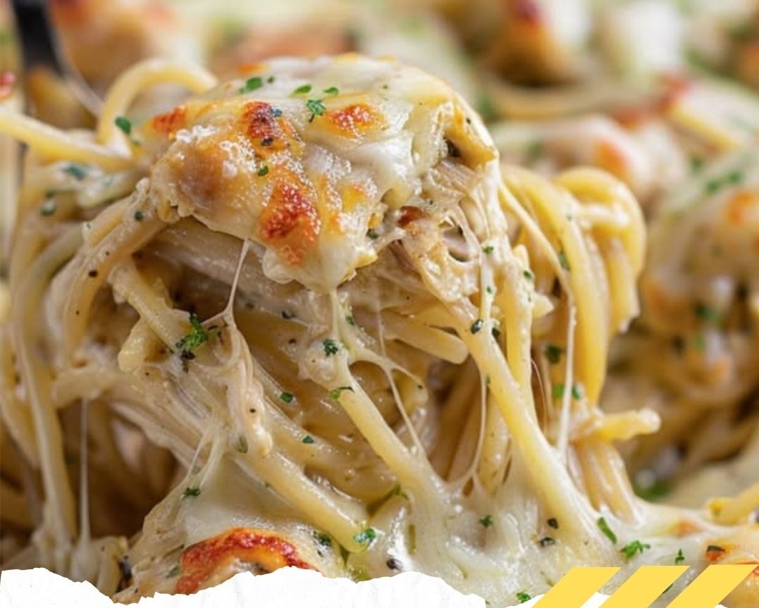 Pour half of the cooked spaghetti into the prepared baking dish, then top with half of the cheesy sauce mixture.