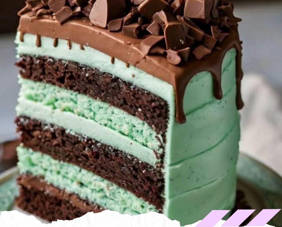 – Spread mint cream on top of one cake layer. Place another cake layer on top and repeat the process. Apply a thin layer of mint cream all over the cake and refrigerate for 30 minutes.
