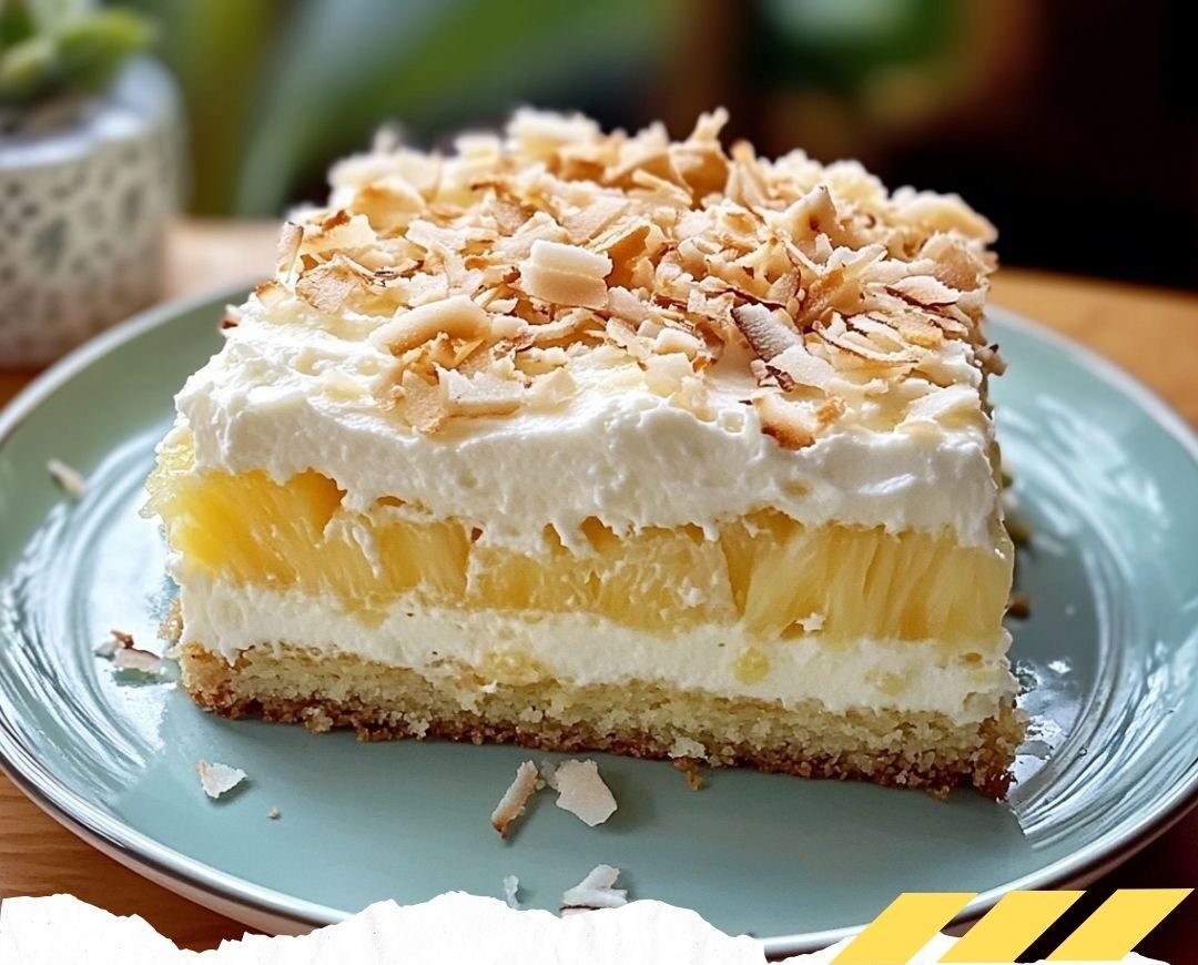 Slice and serve this delightful Pineapple Coconut Dream Cake chilled.