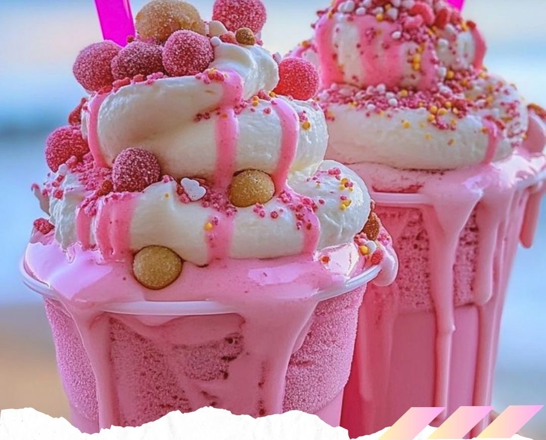 4. To elevate your freakshake, top it off with a generous swirl of whipped cream. Get creative with your garnishes: fluff some pink cotton candy on top, and scatter an assortment of pink candies. Don’t forget to add colorful pink wafer sticks and give it a final touch with a sprinkle of edible pink glitter!