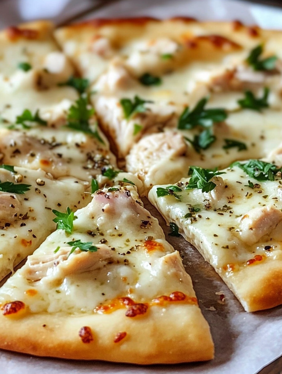 This isn’t your typical tomato-sauce pizza. Instead, it’s rich, creamy, garlicky, and layered with tender chicken and gooey mozzarella. Think of it like a warm hug for your taste buds—familiar, comforting, but just different enough to feel special.