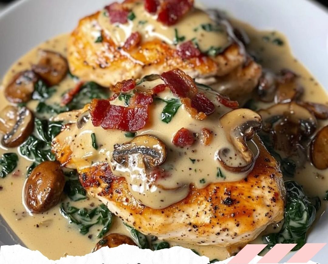 – Return the chicken and bacon to the skillet, spooning the sauce over the top. Cook for an additional 2-3 minutes to heat through.