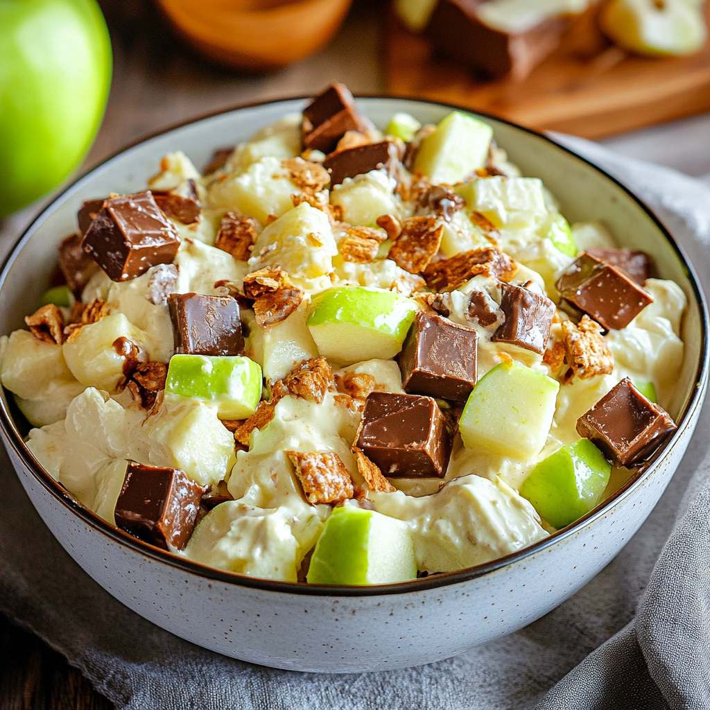Think of it as a cross between a fruit salad and a candy bar sundae. It’s rich, fluffy, crunchy, and fruity all at once. The main stars? Tart Granny Smith apples, chunks of Snickers bars, and a silky vanilla pudding-Cool Whip base that ties it all together.