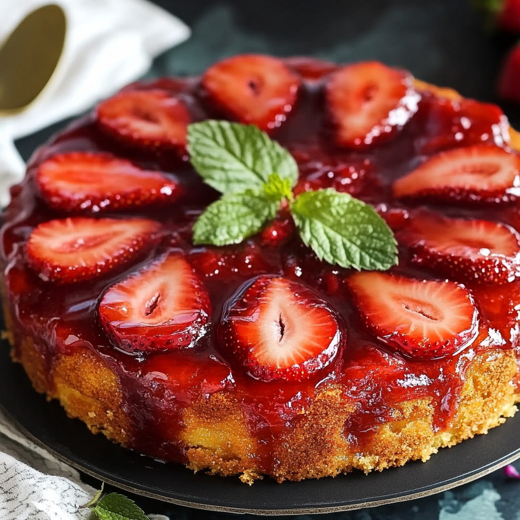 What makes this dessert stand out isn’t just the juicy strawberries or the rich buttery base — it’s the magic moment when you flip the cake. The caramelized sugar blends with the fruit juices, creating a golden glaze that looks too beautiful to eat (but you won’t be able to resist!).