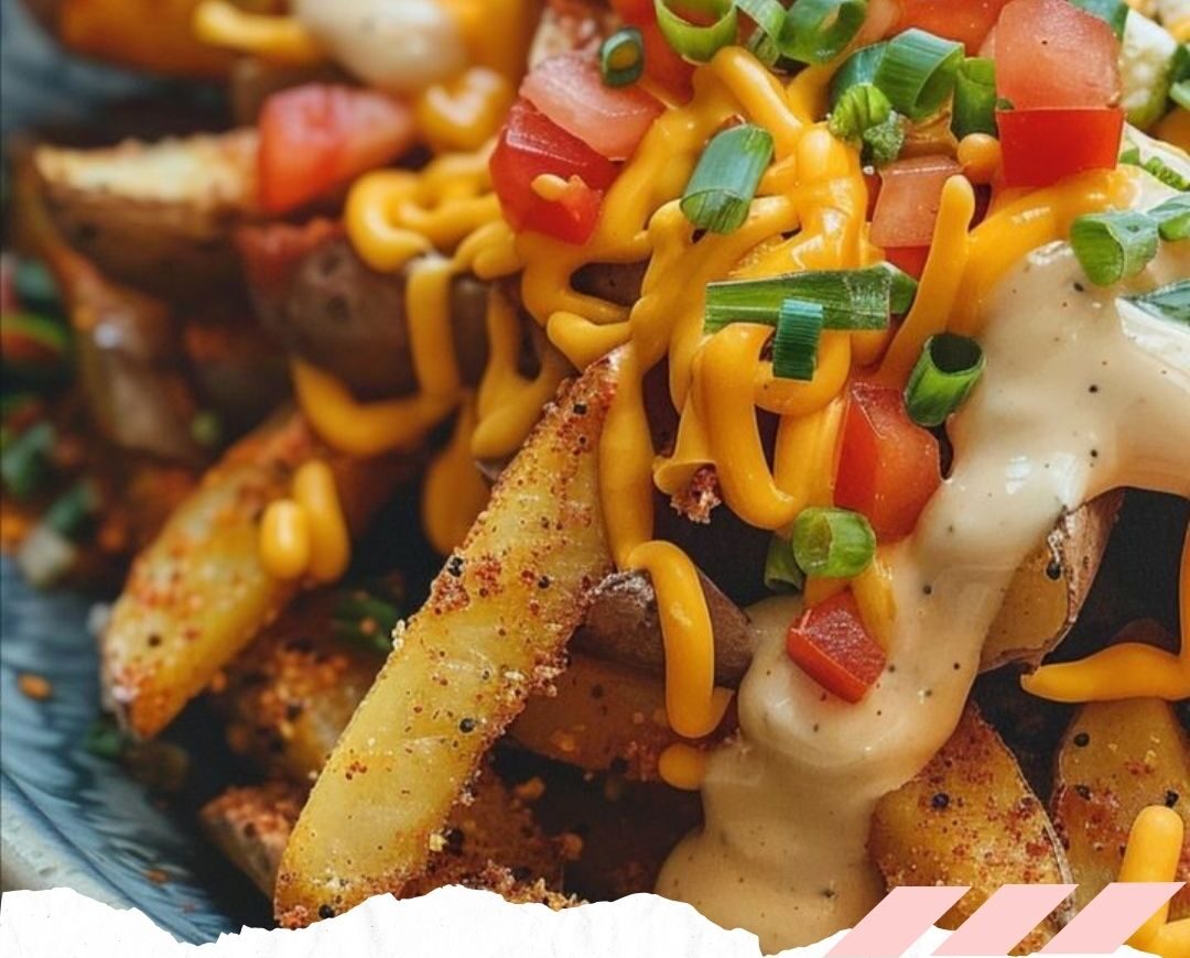 5️⃣ Assemble the nacho fries: Once the fries are done, sprinkle them with the remaining Taco Bell seasoning. Place the fries on a serving plate, pour the warm nacho cheese sauce over the top, and then add sour cream, jalapeños, tomatoes, green onions, and shredded cheese.