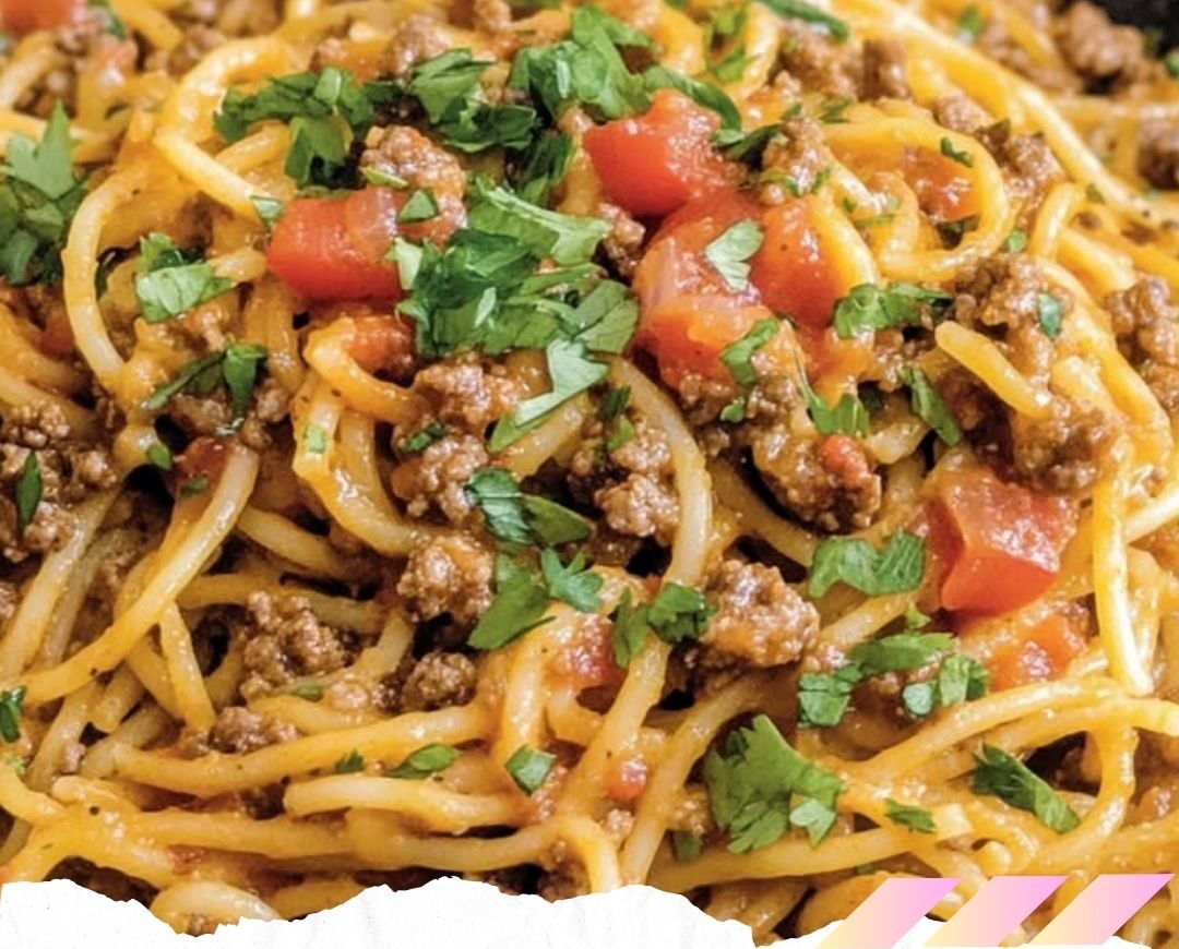 Add taco seasoning, Rotel tomatoes (including juice), spaghetti noodles, and water.